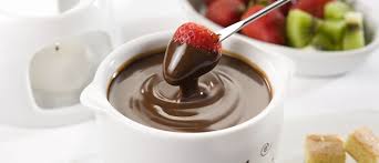 Picar el chocolate. Colocar la crema en una cacerolita y calentar sin que hierva. Incorporar el chocolate a la crema y mezclar. Agregar el dulce de leche, la ralladura de naranja y el coñac. Una vez fundidos los ingredientes retirar del fuego y servir tibia acompañada de trozos de frutas. merengues y cubos de bizcochuelo.